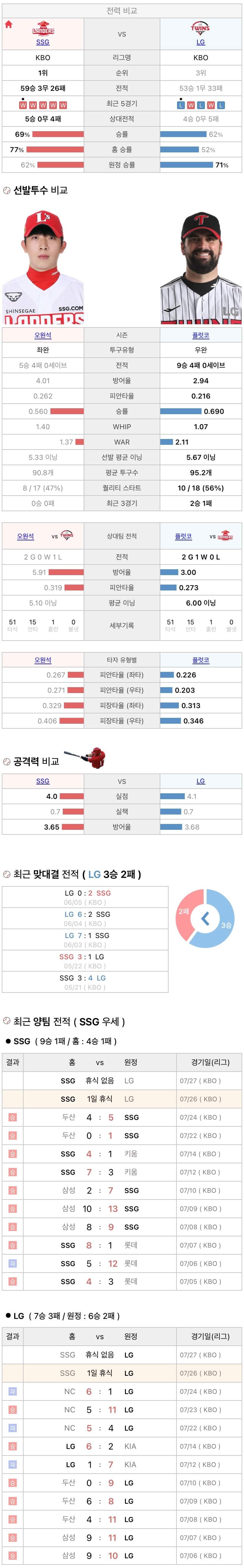 7월26일 KBO 프로야구 LG vs SSG 분석